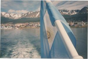 Bandeira da Argentina com a cidade ao fundo-Ushuaia