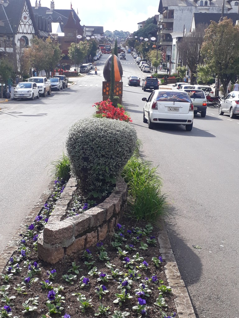 Hoje é dia de passeio do BUSTOUR, o double-decker gramadense com áudio. R$89,00 para mim e R$79,00 para o Carlos, para maiores de 60 anos. Iniciamos pela parada 15: loja Brocker Turismo na Avenida das Hortênsias, 1845-centro, onde compramos o ticket do ônibus. Cruzamos a av. Borges de Medeiros, com iluminação temática e fios subterrâneos. Rua Torta ou rua Emílio Sorgetz, inspiração da rua sinuosa em São Francisco-Califórnia-Estados Unidos, dita Lombard Street. Gramado sempre inovando, município limpo, florido, bom para fotos.