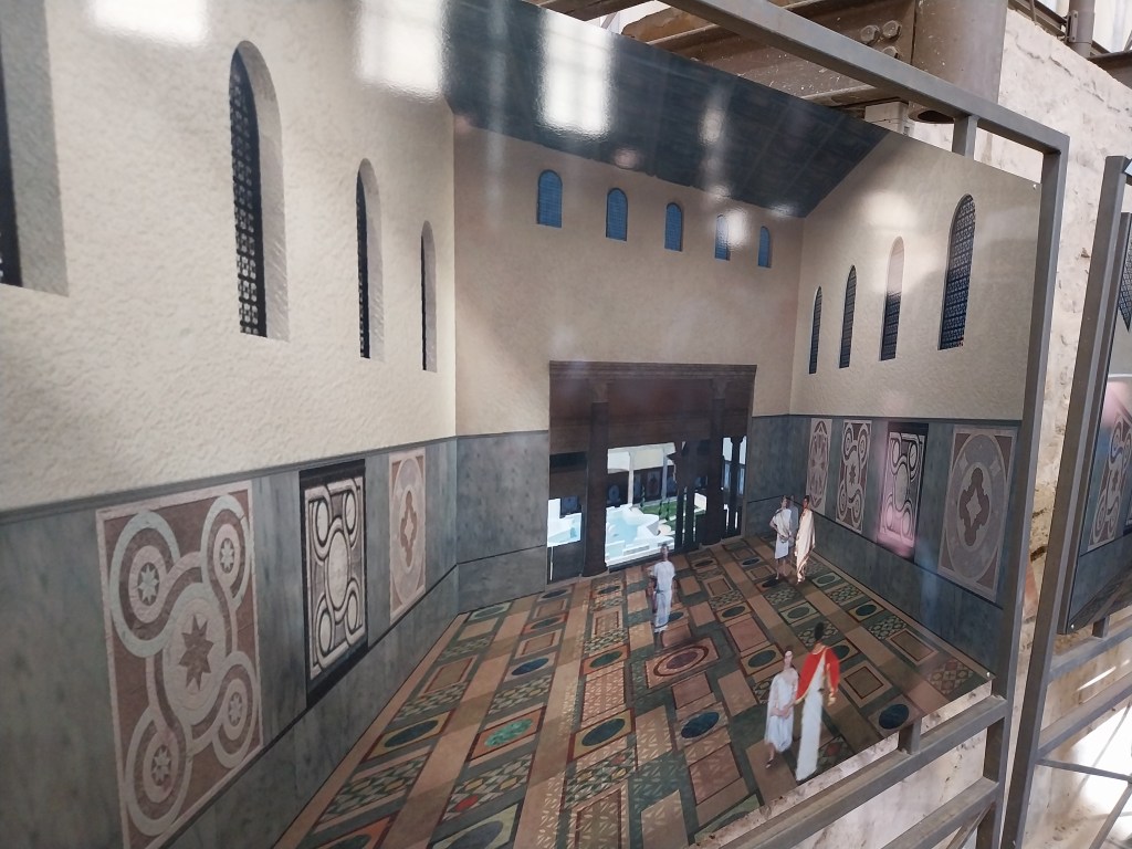 Basílica, sala do poder, do trono. O imperador controlava a entrada das pessoas. O tetrarca Maximiniano (286-305 d. C.) era chamado de Hércules, por ser forte como o herói mitológico. Tinha trono no fundo, estátua de Hércules em mármore. Colunas de granito do Egito. Era um tribunal, o local é mais palácio do que vila.
