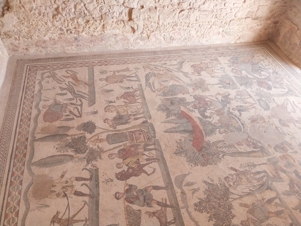 Sala geométrica para escravos. Mosaicos, todos diferentes. Capturavam animais em jaulas, depois os transportavam de barcos para Roma. Corredor da caça: os mosaicos mostram animais sendo caçados no norte da África, sala gigante. Um rinoceronte sendo caçado e cachorros ajudando a ação. Em outra sala: a Face de Orfeu.