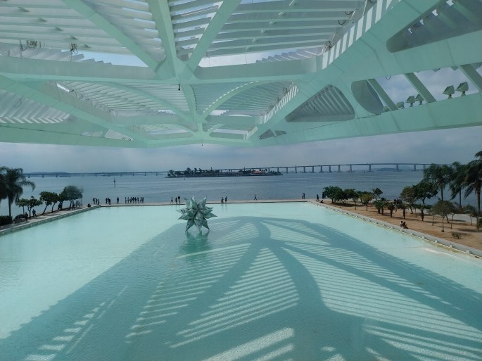 Resolvemos ir embora em direção ao Porto Maravilha. O motorista do Uber Adhemar nos levou. Queria muito conhecer o Museu do Amanhã (Praça Mauá,1). Museu de graça para maiores de 60 anos. Compram-se as entradas nas máquinas. Antes de entrar, uma exploração dos arredores do museu. Que beleza de visual. As piscinas dão um charme e convidam a fotos da baía da Guanabara. Foi inaugurado em dezembro de 2015 e o prédio era um antigo píer desativado o qual foi transformado nessa estrutura admirável, inspirada em elementos da natureza, como bromélias, que integra-se à paisagem naturalmente.