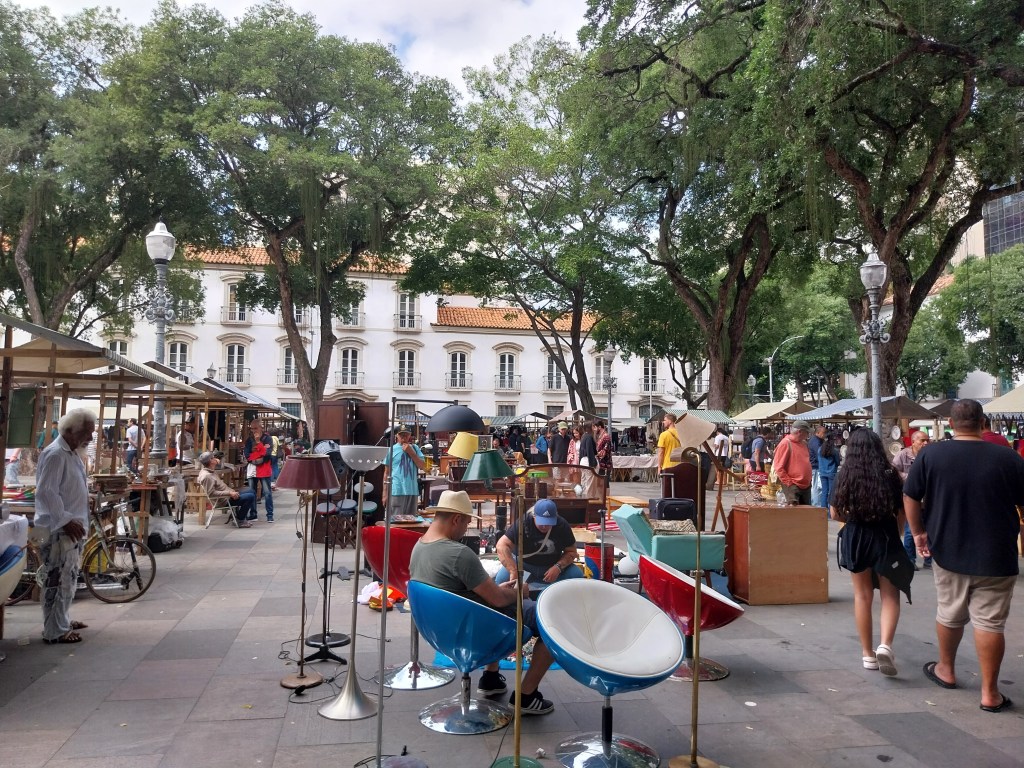 Hoje é sábado, dia 16 de agosto de 2025. Às 9 h o nosso amigo carioca Carlos Renato Machado passa para irmos a Niterói. Minha segunda vez. De Uber fomos à praça XV de Novembro e nos deparamos com o mercado de pulgas. A feira de antiguidades, quinquilharias e brechó é muito interessante. Estilo San Telmo em Buenos Aires, tem muita gente, bancas com comidas, tortas, sucos e vendas no chão. Nunca vi igual. O povo coloca um pano e espalha suas vendas. Vale a pena explorar aos sábados.