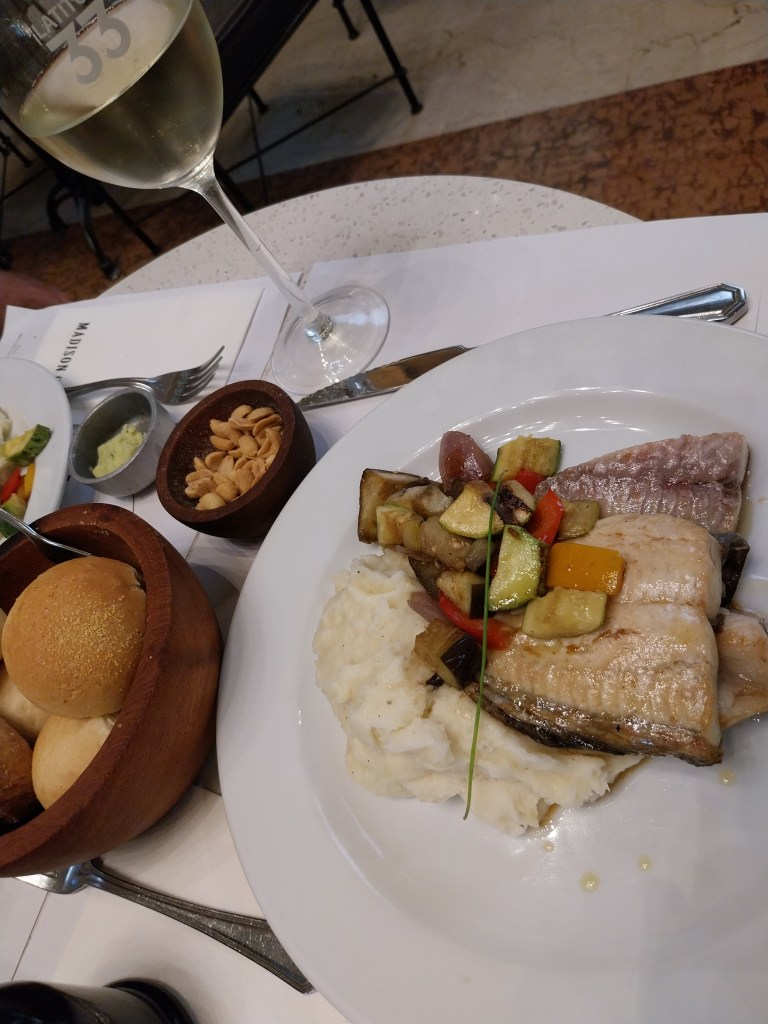 Saímos para os passeios. Pela rua Florida existe um mercado de pequenas lojas que vale a pena conhecer. Live Shop na Florida, 520. Lá têm blusas de lã de padronagens diferentes, do jeito que gosto, além de um Punto Dulce, com alfajores e doces de leite e outros estandes interessantes. Passamos pela porta do Centro Naval. Linda. E rumamos às Galerias Pacífico para almoçar no Madison Café. Menu: surubim com ratatouille (receita francesa) de vegetais, acompanhado de uma taça de vinho branco e um espumante. O peixe surubim, gorduroso como o sirigado, o prato delicioso. Pedimos um café ristretto: café forte, mais intenso e concentrado, e em pequena quantidade, e um espresso: mais suave que o ristretto. Estilo italiano.