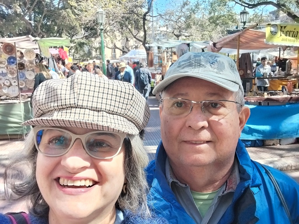 Hoje é domingo, dia 8 de setembro de 2024. O bom do café da manhã do hotel Gran Hotel Buenos Aires é o doce de leite, o queijo cremoso e os croissants salgados e doces. Dia animado para ir à feira de San Telmo, só em pensar já fico feliz. Pegamos o táxi para a praça Dorrego, onde ocorre a feira desde 1970. Tudo limpo na cidade, ruas, praças, parques. Dá gosto.