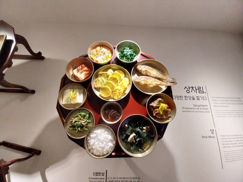 E entramos com o passaporte. Há exposições itinerantes e as fixas se encontram no 1° andar. Na sala Kim Yun Shin, vimos pinturas inspiradas nos preceitos do budismo, além de esculturas. No térreo, exposição de comidas e sua preparação, roupas da época do Império Joseon (ou Dinastia Joseon, de 1392-1897), casas com quartos separados para homens e mulheres. Amei. Sala de Hanbok-roupas e a sala de Hansik-comidas.