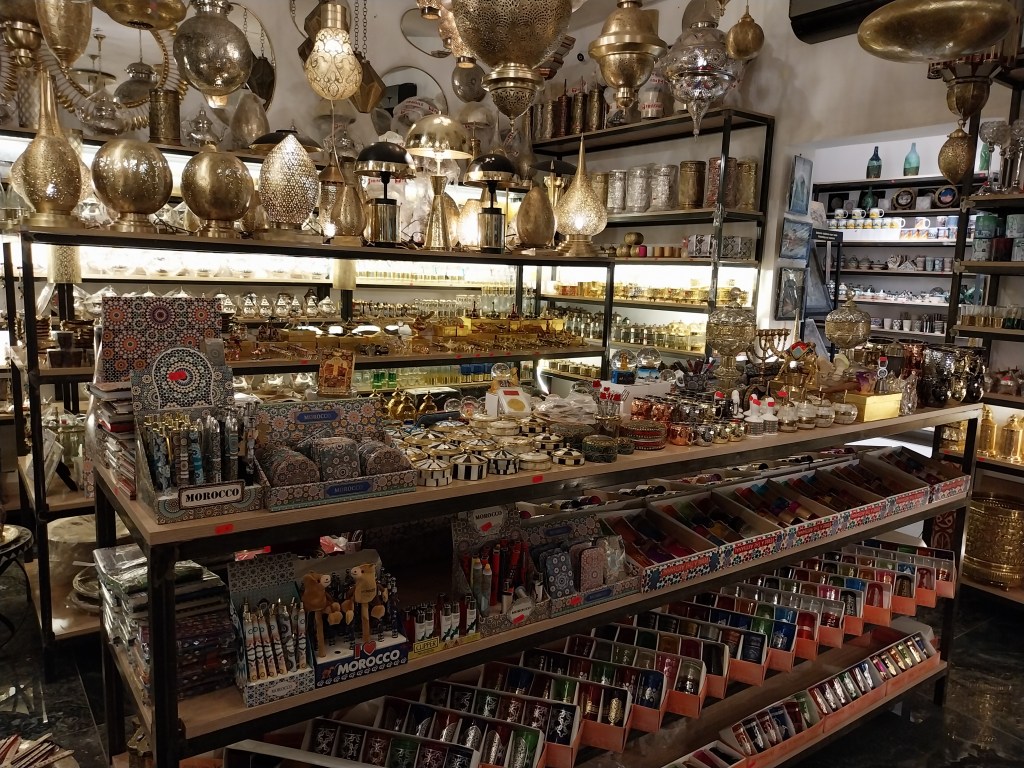Visita ao exterior da mesquita Koutoubia, irmã gêmea da Giralda de Sevilha na Espanha. Menara significa “farol religioso ou que indica o caminho”. Vemos o minarete: al-manara, um farol que indica o caminho para as chamadas religiosas e o caminho dos viajantes. No Marrocos, funcionava a Rota do Sal, para conservar a saúde para a pele (dermatologia), como feridas de pele de humanos e animais, dromedários, por exemplo. No séc. XVI, o sal era trocado por ouro. Combinado com a Rota do Sal, havia a Rota da Seda, a China oferecia chá, arroz e laranjas, a Índia especiarias. Havia ladrões no Atlas e na Península Ibérica de “olho” nas mercadorias.