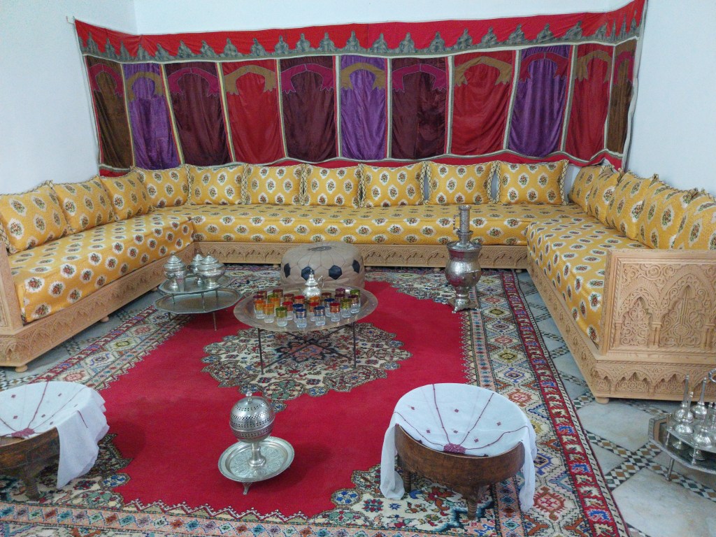 O salão marroquino com sofás e de mármore italiano com acesso privado era o da favorita. O guia nos conta muito sobre a cultura à época. Na religião se aceita o divórcio se o casamento não estiver bom. No Marrocos não se usa burca, não é obrigada a se cobrir toda. Nos jardins de inverno do palácio, havia espaço para as quatro esposas/mulheres em um pátio grande passearem e tomarem vitamina D sem cruzarem uma com a outra. Hoje são usados para eventos culturais, musicais e de casamentos. Os guias falam de forma aberta sobre assuntos matrimoniais.