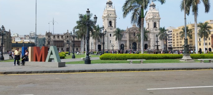 Plaza Mayor (praça Maior), espaço público que por motivos de manifestações estava fechado ou havia alguma reunião importante no Palácio do Governo. O calor está grande. Há jardins diversos, árvores, fonte de água no centro da praça. Tudo bem cuidado, amplo, belo. Segundo a Wikipédia, originalmente a Plaza Mayor era rodeada de casario simples de comércio. O site https://guia.melhoresdestinos.com.br adiciona que a Plaza de Armas (praça de Armas) foi onde Francisco Pizarro fundou a cidade de Lima em 1535. Durante a era colonial foi palco de touradas, execução de condenados pela Inquisição Espanhola, declaração de Independência do Peru em 1821, além de ponto de encontro de movimentos libertários a favor da república. Tem mais: o nome Plaza de Armas, normalmente usado em praças de urbanismo espanhol, foi gradualmente substituído por Plaza Mayor durante o período colonial. Este último refletia a identidade da nova cidade de Lima. É ponto de referência para vários locais turísticos, como a Catedral, o Palácio do Governo, o Palácio do Arcebispo, a Casa do Ouvidor e até o Complexo de São Francisco de Assis, que está próximo.