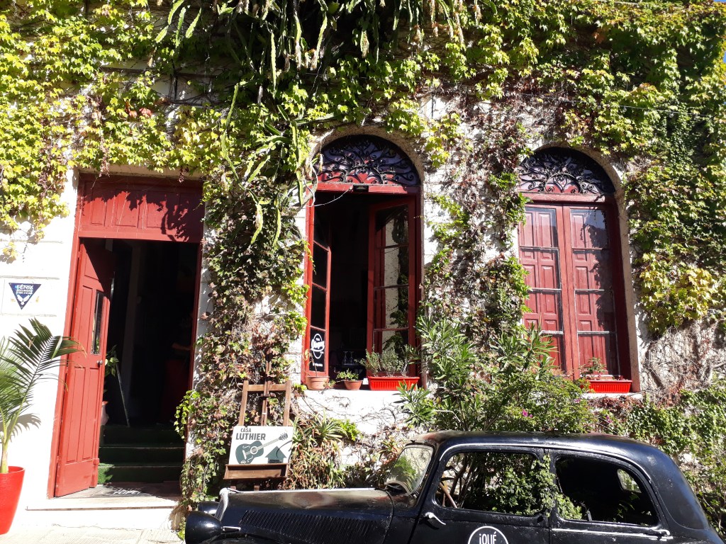 As casas vistas por nós são adoráveis, por serem floridas. Caminhamos pelo bairro. Paramos no restaurante Viejo Barrio Restaurante and Bar (Vasconcellos, 169), com comida caseira e bem comentado. As mesinhas na calçada são convidativas. Colônia tem outro compasso, tudo é calmo e lento. O almoço foi peixe grelhado e vinho tannat em jarra. Escutamos passarinhos e temos cachorros ao lado, aliás, vi água para os cães na frente das lojas. Muito justo. Há muitos soltos pela cidade. Detalhe: mulher pode viajar só no Uruguai. É seguro. No nosso passeio havia três.