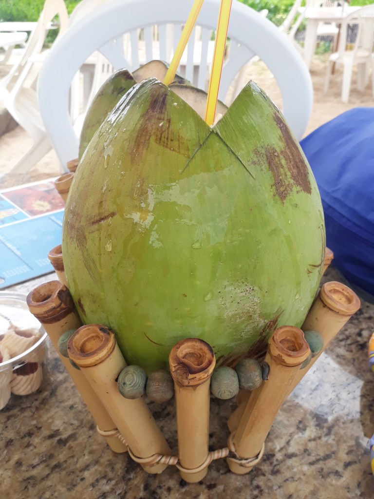 Há banho de mar e lagoa entre os dois, há uma ponta de terra onde não se banha. Chegamos às 9 h, com um cenário deslumbrante, um coqueiral imenso, são da fazenda Sococo. Lembrei de Icapuí no litoral leste do Ceará, fronteira com o estado do Rio Grande do Norte, uma das paisagens mais belas que conheço.