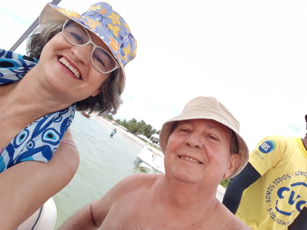 Tomamos banho de mar de águas calmas antes do passeio de catamarã, nossa escolha. O guia Hélio chama de passeio ostentação (cabem 180 pessoas) com serviço de bar e petiscos, música e animação. O coquetel de abacaxi estava bem tropical (R$22,00). Visualizamos a frente da Barra de São Miguel, a casa das marisqueiras, a casa do cantor alagoano Djavan, da Xuxa, da Tereza Collor (Ilha de Três Corações) e ainda há uma parada para banhos e fotos. O fotógrafo é o Natan.