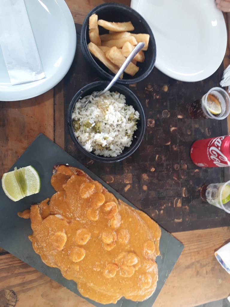 Ficamos na barraca Pajú, ponto de apoio, onde ganhamos uma pulseira para consumo. Existem outras barracas/restaurantes, mas cobram day-use para cadeira e guarda-sol. No restô, dão cartão de consumo e podemos ficar em qualquer lugar. Os espaços se chamam gazebos e há guarda-volumes para alugar (R$10,00). Fazemos a pré reserva do almoço, uma vez que muita gente frequenta o local, e os guias chamam os alagoanos de talentosos, ou seja, lentos, devagar quase parando. Pode? Os nativos devem estar certos, se apressar para quê se estão no paraíso? O almoço foi de peixe (cavala) grelhado ao molho de camarão com macaxeira e arroz de brócolis.